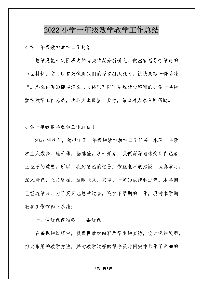 2022小学一年级数学教学工作总结