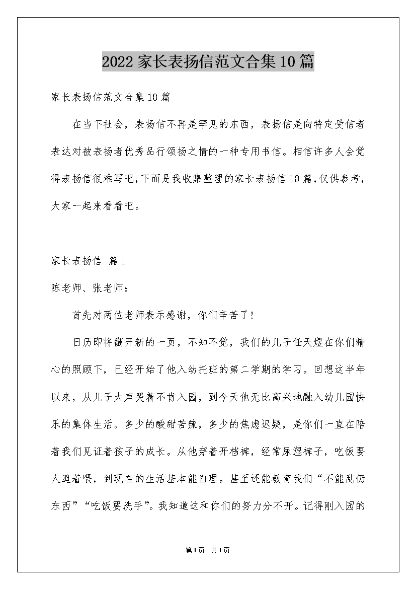 2022家长表扬信范文合集10篇