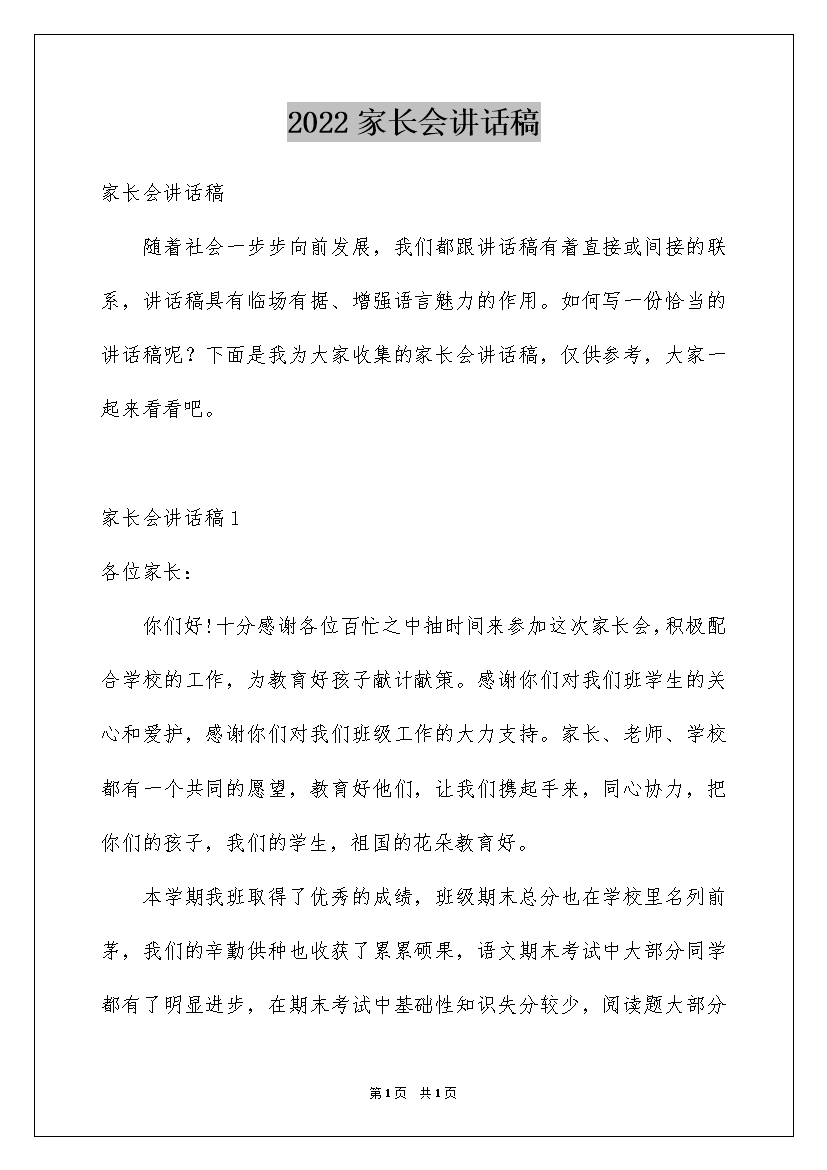 2022家长会讲话稿