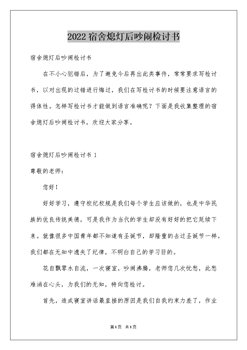 2022宿舍熄灯后吵闹检讨书
