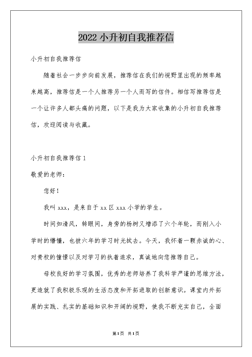 2022小升初自我推荐信