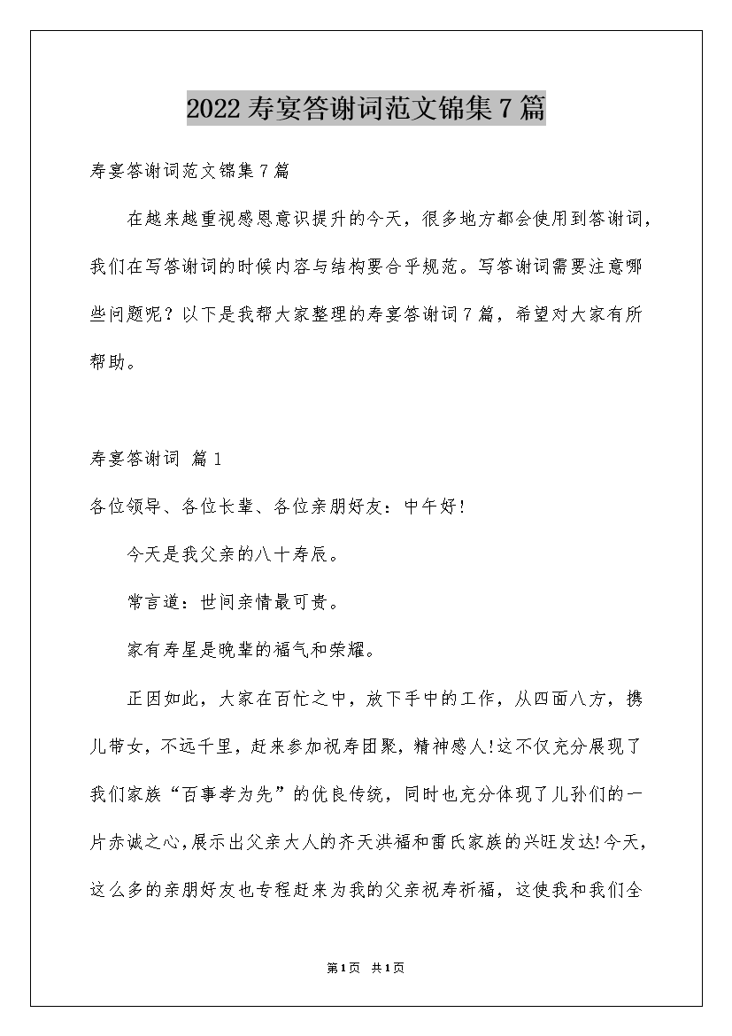 2022寿宴答谢词范文锦集7篇