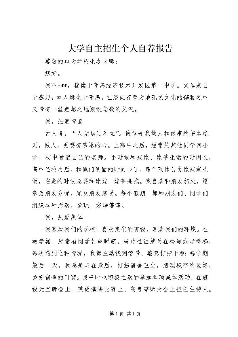 大学自主招生个人自荐报告