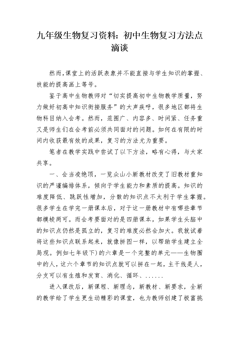 九年级生物复习资料:初中生物复习方法点滴谈
