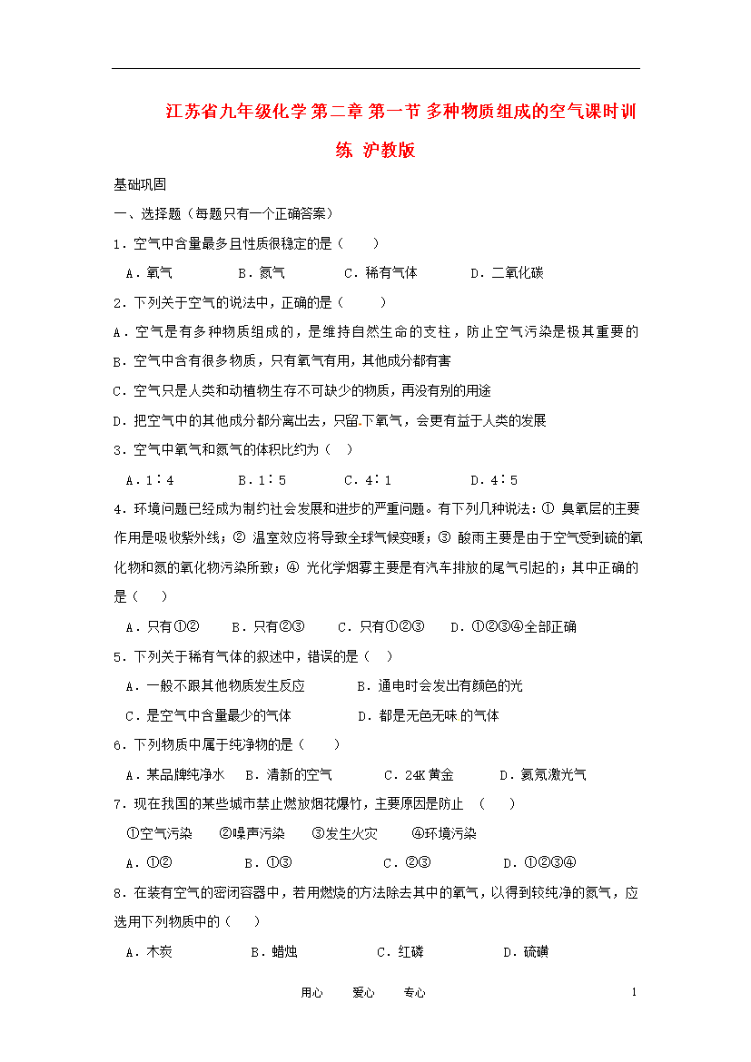 试题-江苏-2012_江苏省九年级化学 第二章 第一节 多种物质组成的空气课时训练 沪教版