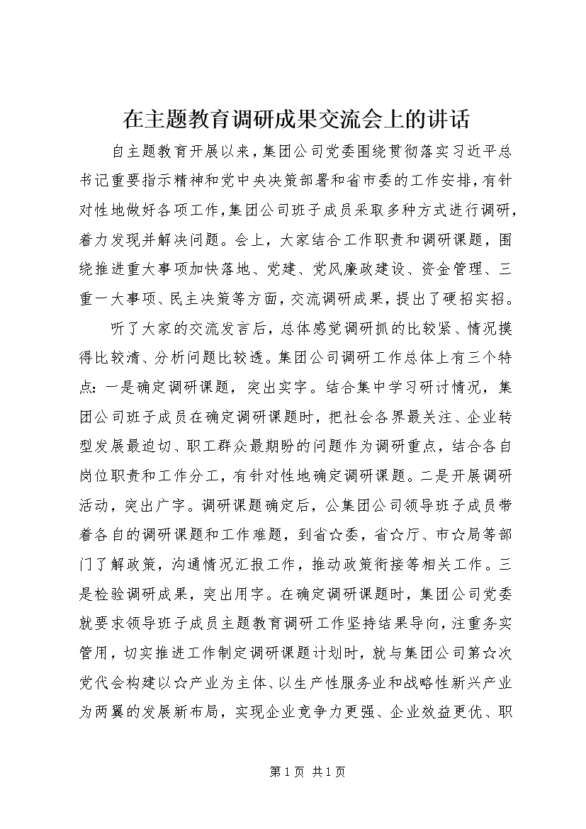 在主题教育调研成果交流会上的讲话