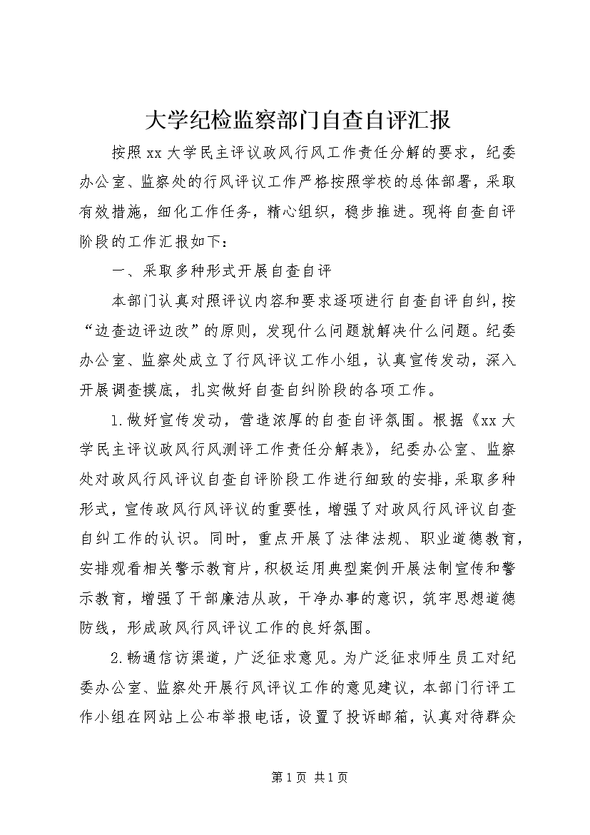 大学纪检监察部门自查自评汇报