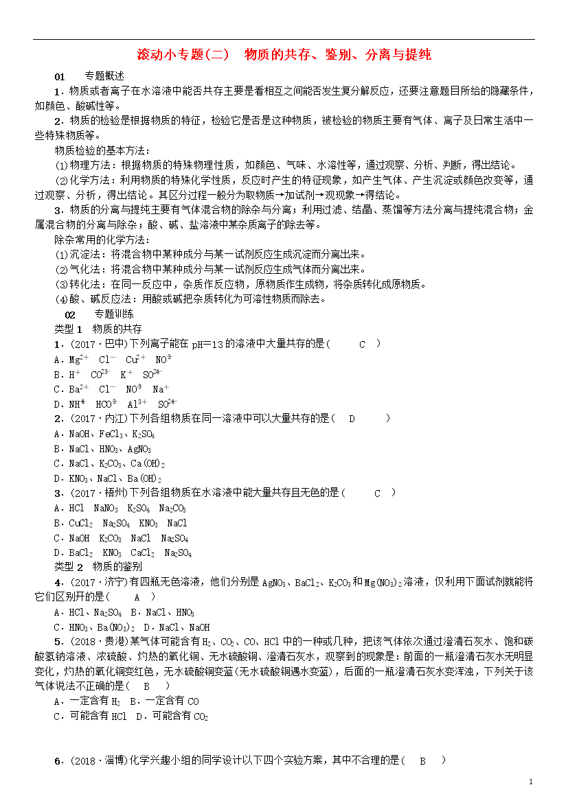 试题-全国-2018_2018年秋九年级化学下册 第八单元 海水中的化学 滚动小专题(二)物质的共存、鉴别、分离与提纯同步测试 (新版)鲁教版