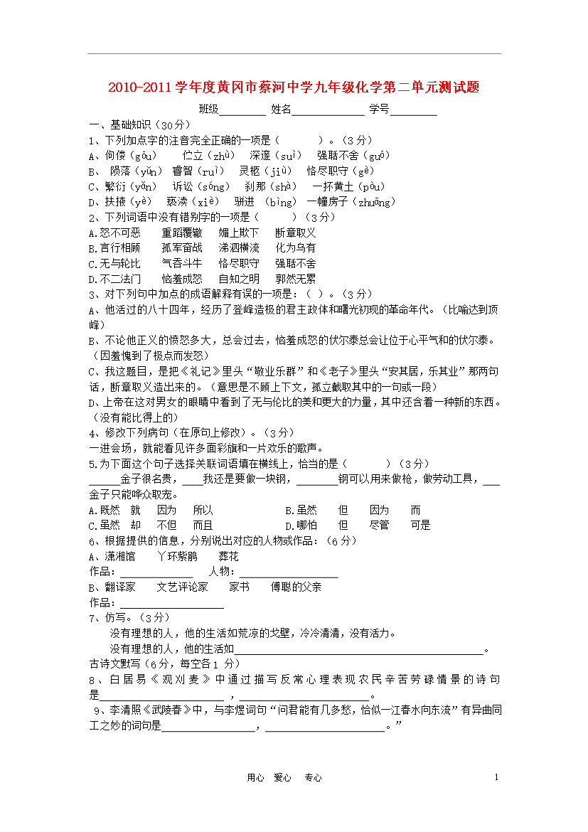试题-湖北-2010_湖北省黄冈市蔡河中学2010-2011学年度九年级化学第二单元测试题