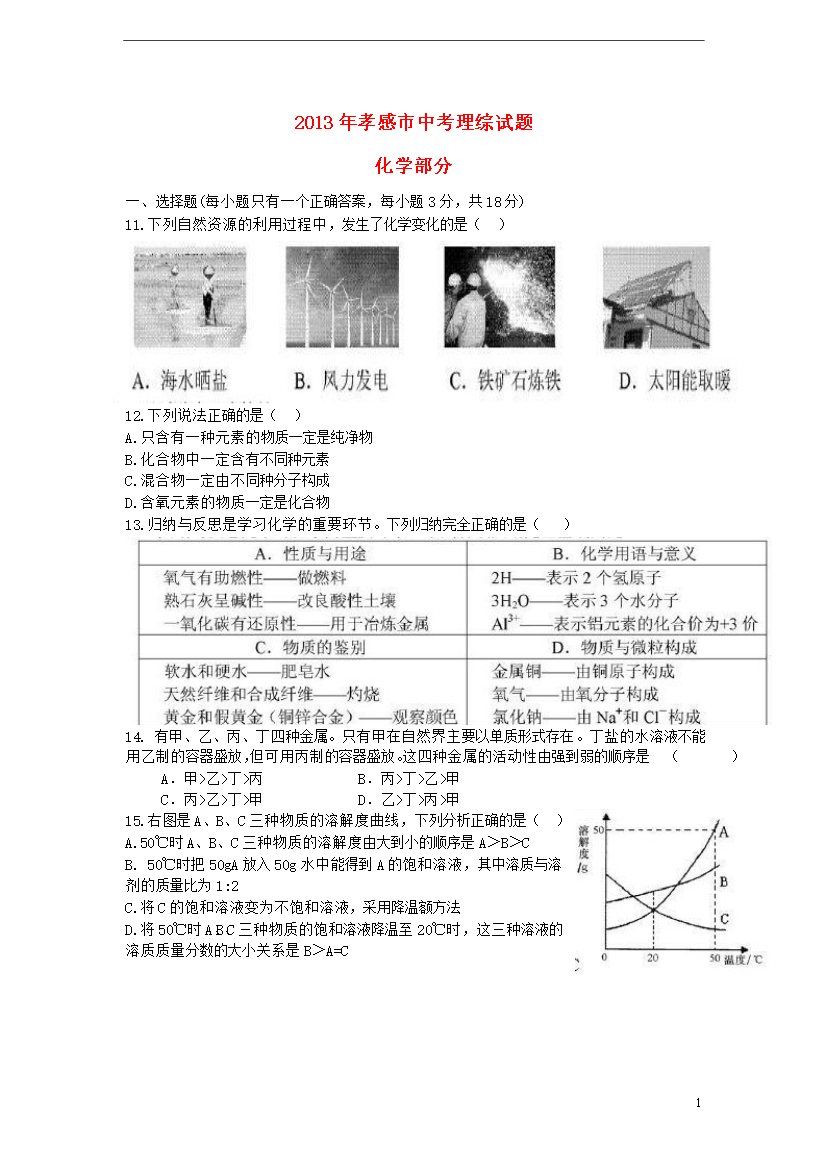 试题-湖北-2013_湖北省孝感市2013年中考理综真题试题(化学部分)