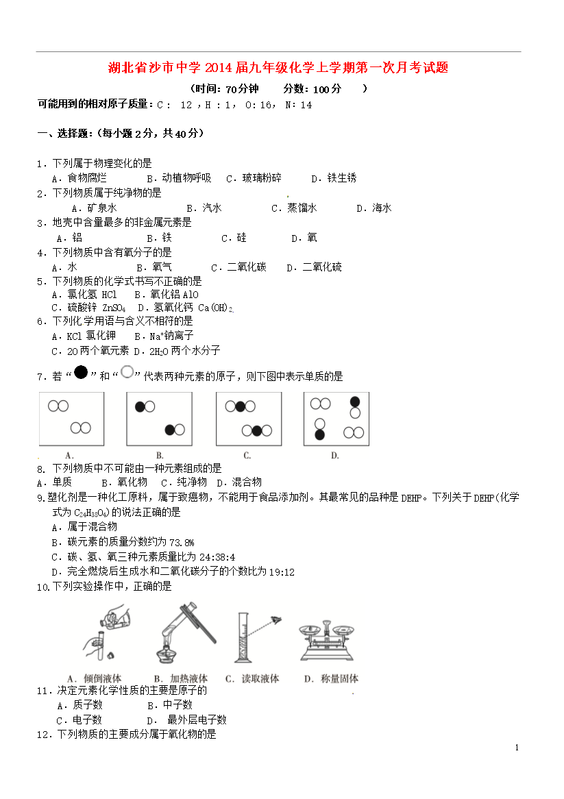 试题-湖北-2014_湖北省沙市中学2014届九年级化学上学期第一次月考试题(无答案)