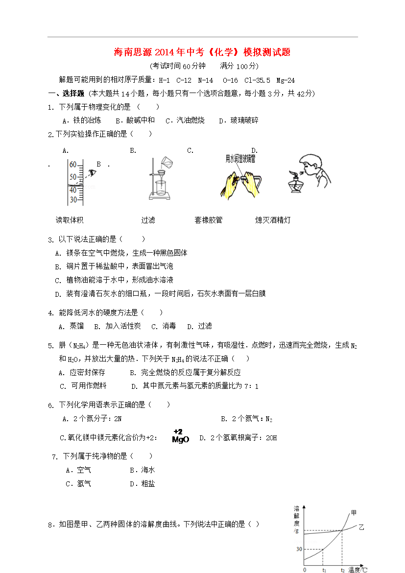 试题-海南-2014_海南省定安县思源学校2014年中考化学招生联合模拟试题