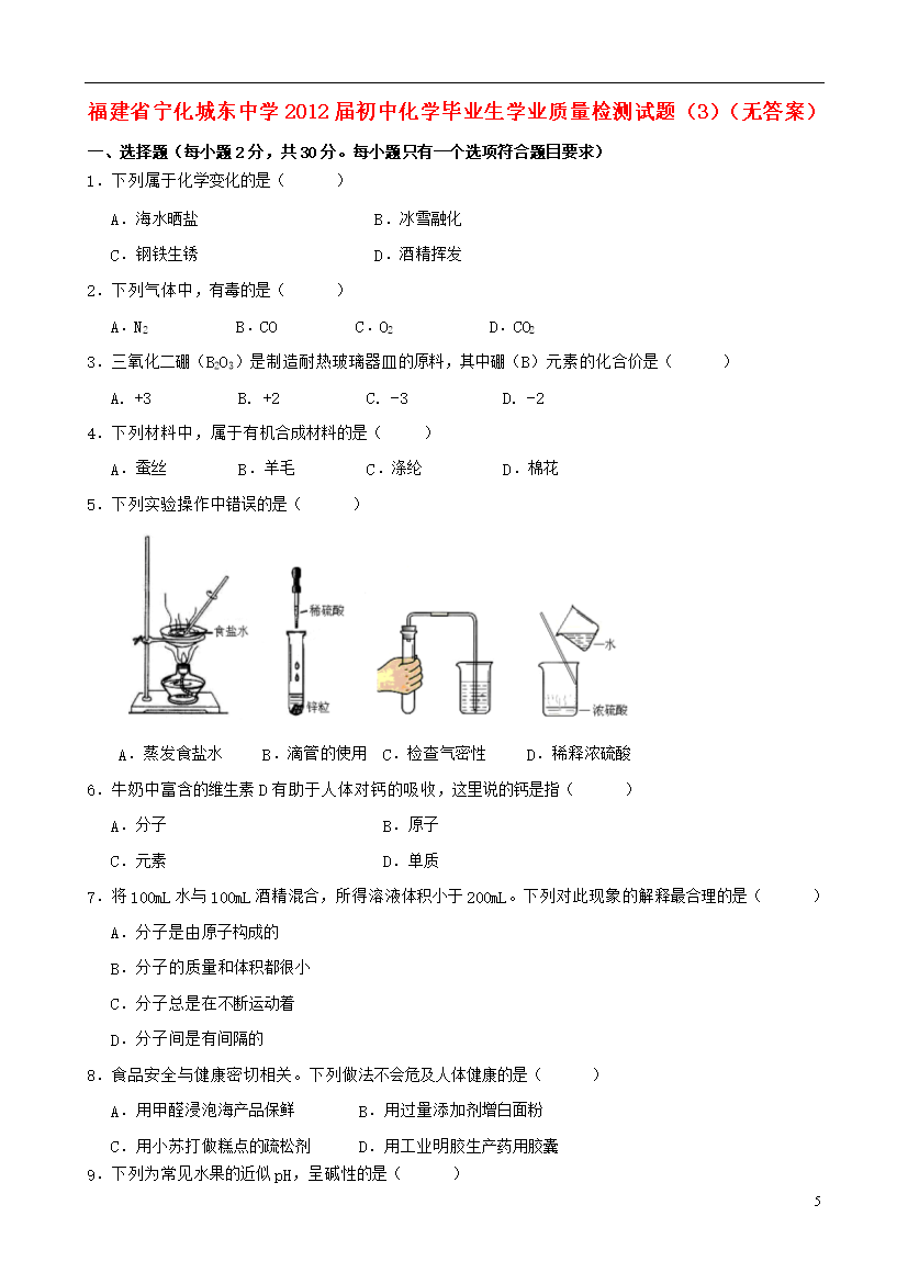 试题-福建-2013_福建省宁化城东中学2012届初中化学毕业生学业质量检测试题(3)(无答案)