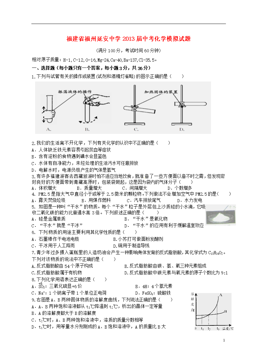 试题-福建-2013_福建省福州延安中学2013届中考化学模拟试题