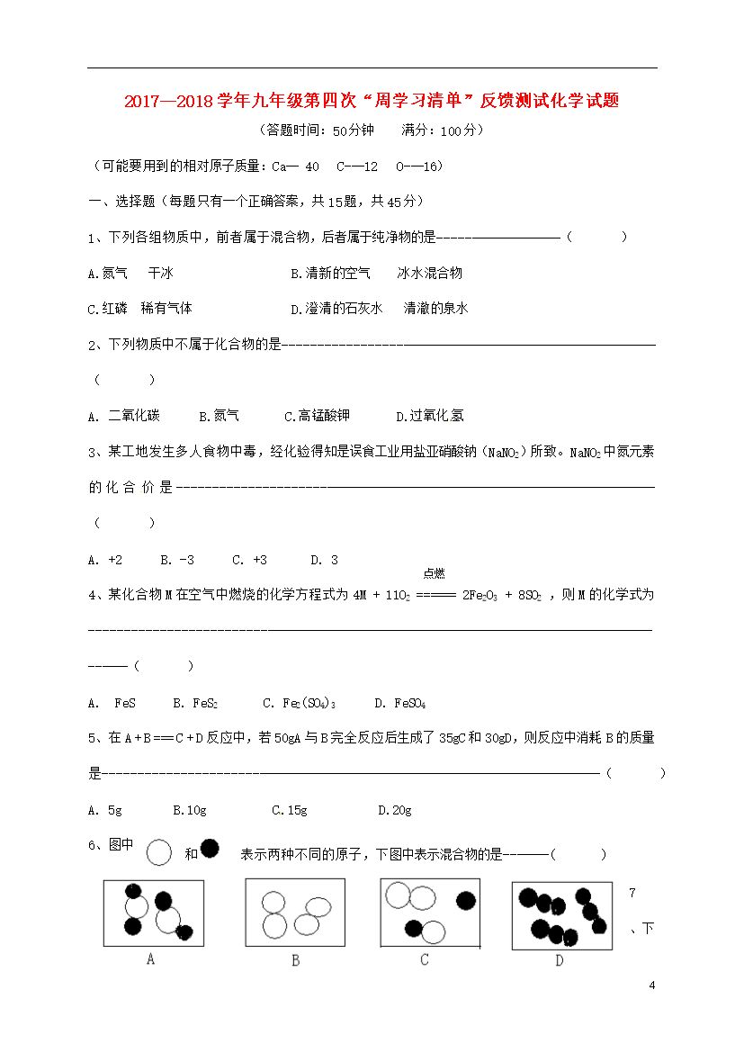 试题-福建-2018_福建省三明市尤溪县2018届九年级化学上学期第四次“周学习清单”反馈测试试题(无答案)