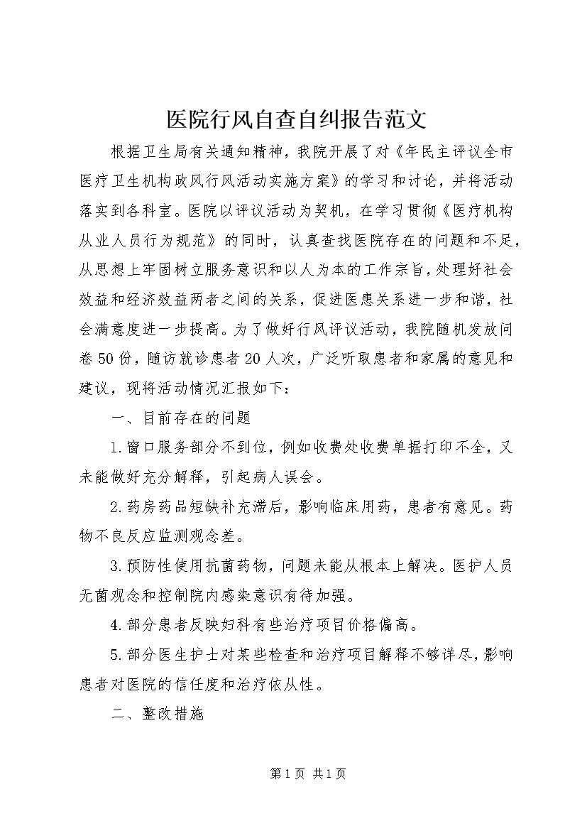 医院行风自查自纠报告范文