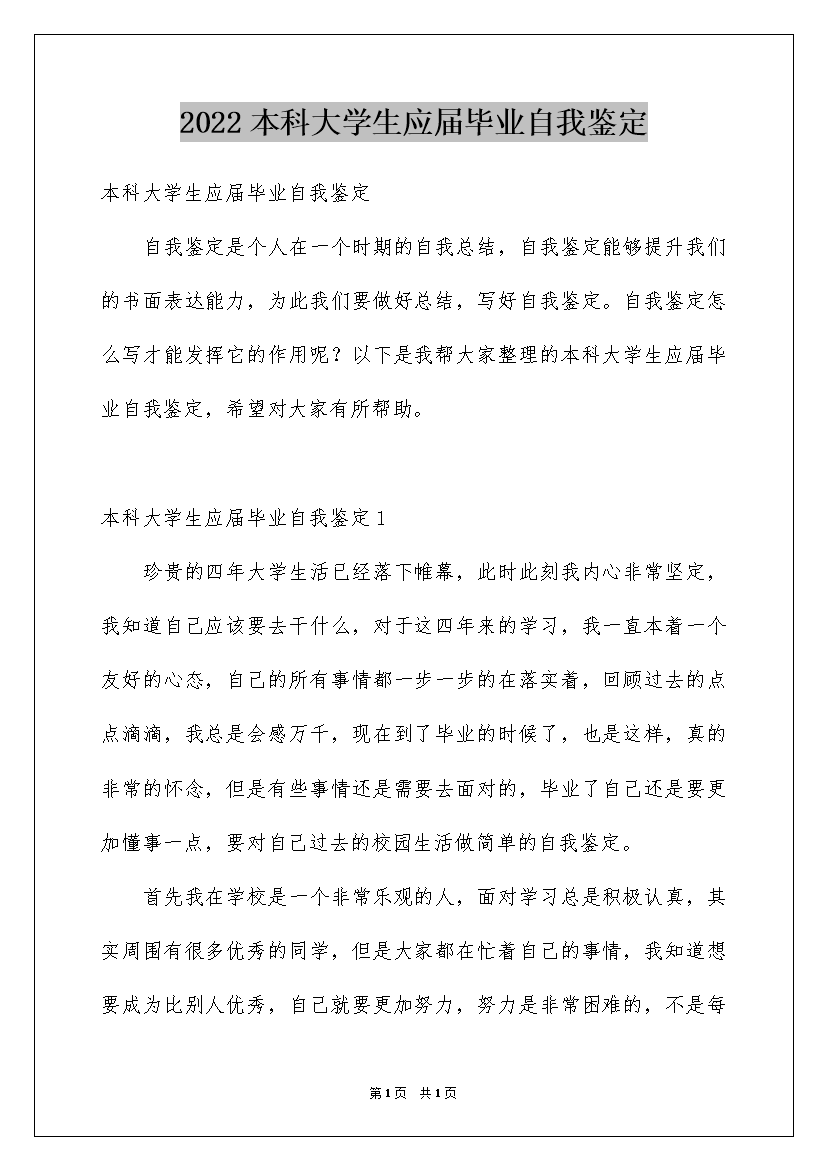 2022本科大学生应届毕业自我鉴定