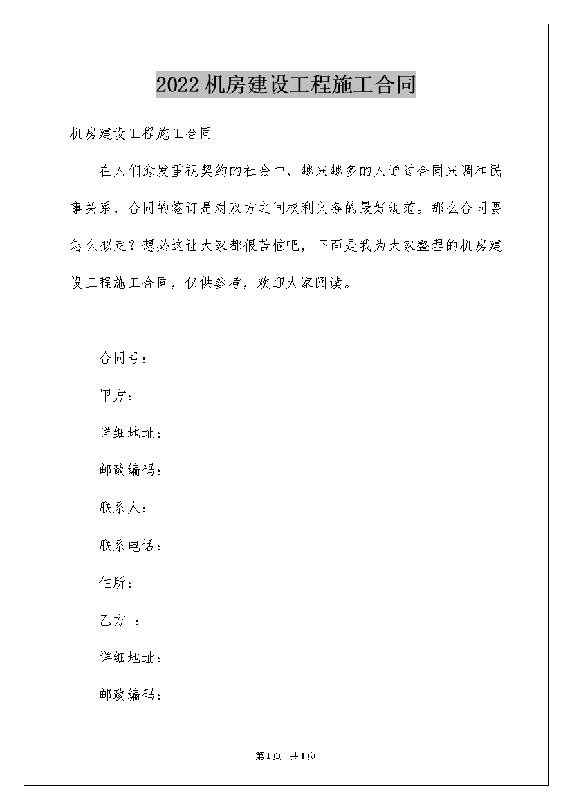 2022机房建设工程施工合同