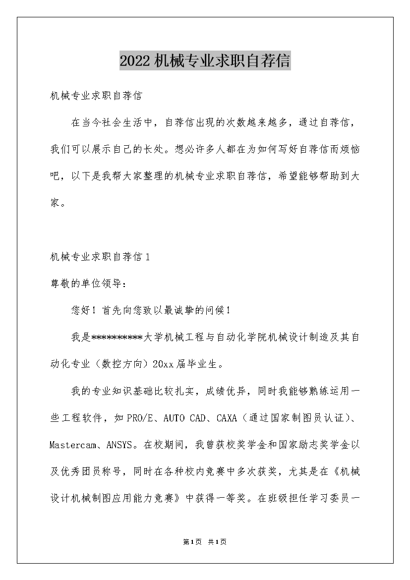 2022机械专业求职自荐信