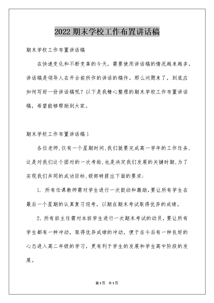 2022期末学校工作布置讲话稿
