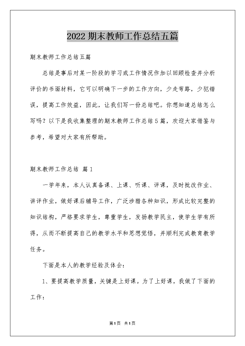 2022期末教师工作总结五篇