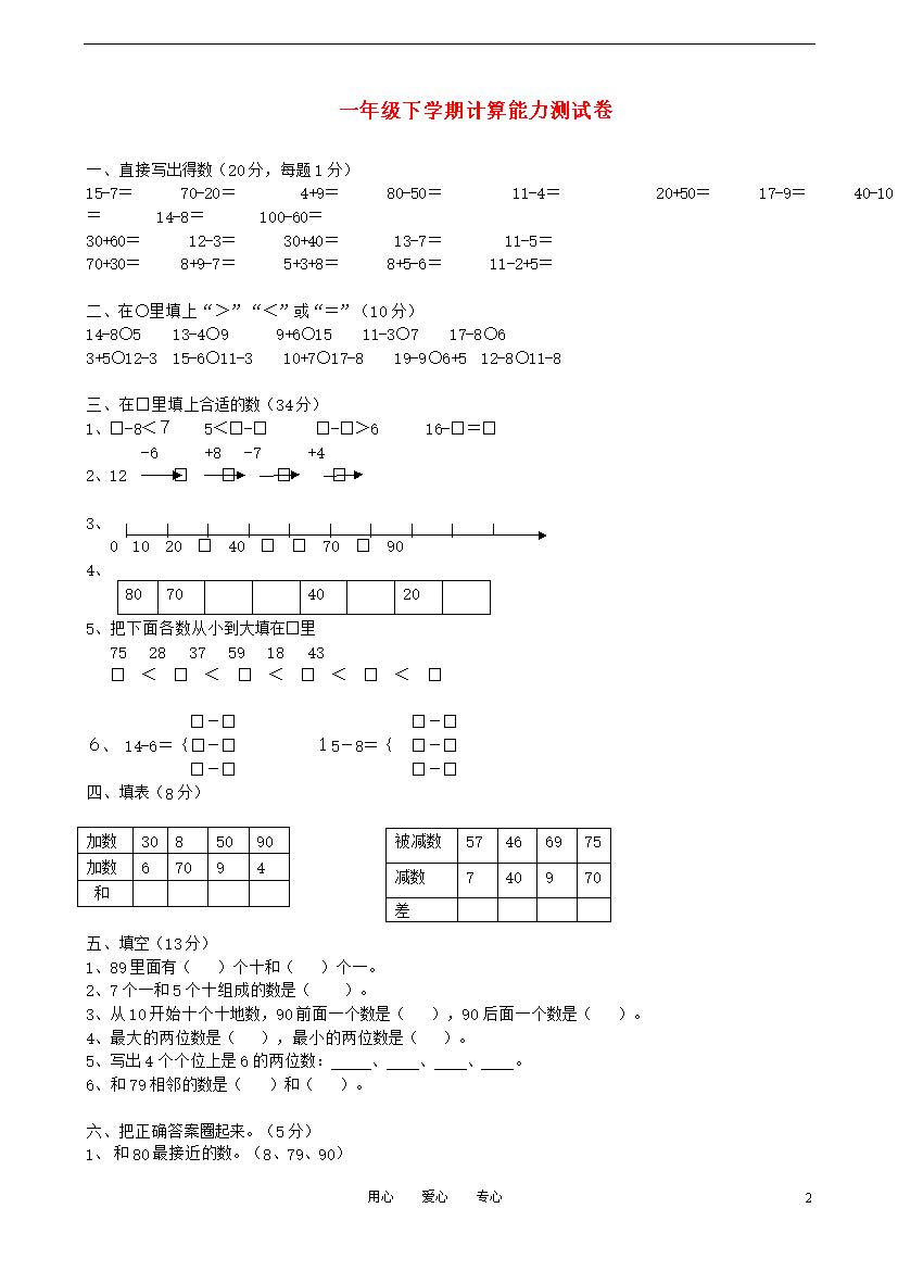 试题-全国-2011_一年级数学下册计算能力比赛试题(无答案)