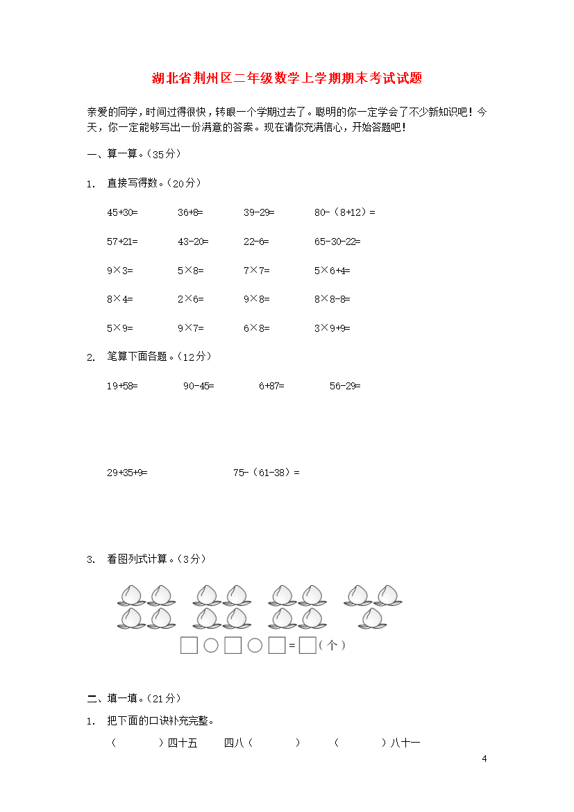 试题-湖北-2020_湖北省荆州区二年级数学上学期期末考试试题