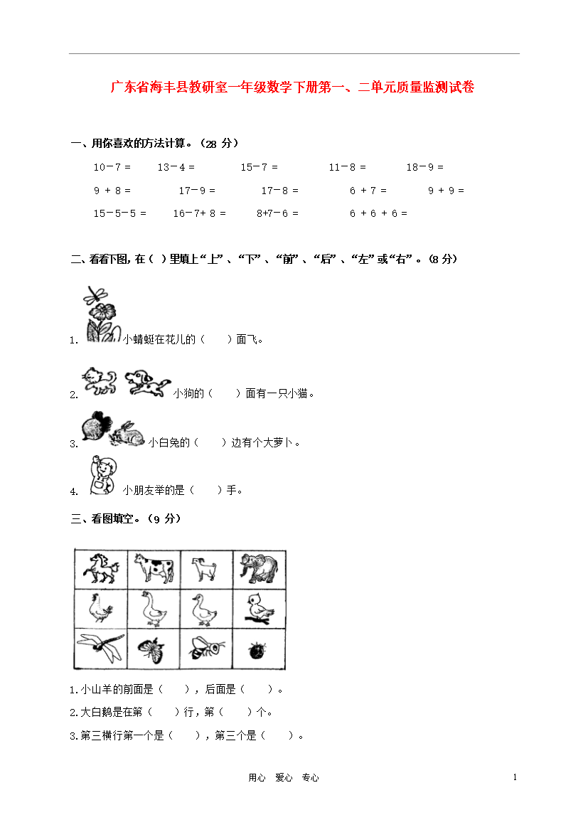 试题-广东-2011_广东省海丰县教研室一年级数学下学期第一、二单元质量监测试卷(无答案)