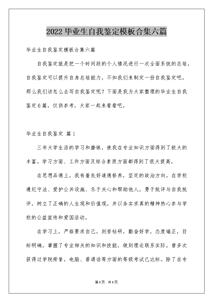 2022毕业生自我鉴定模板合集六篇