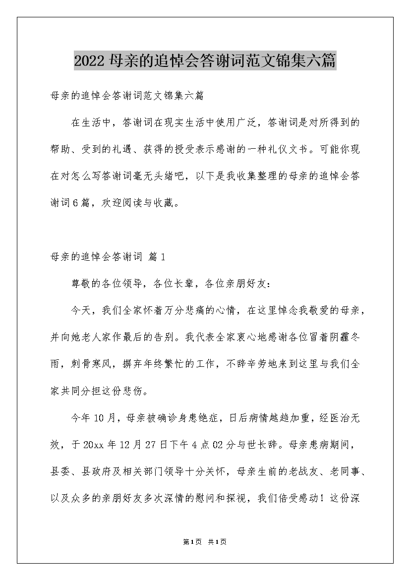2022母亲的追悼会答谢词范文锦集六篇