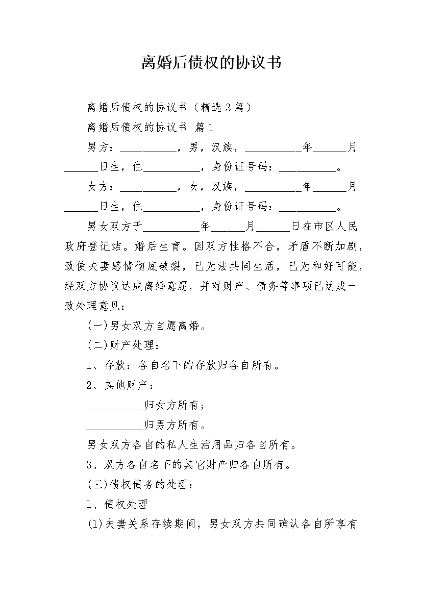 离婚后债权的协议书