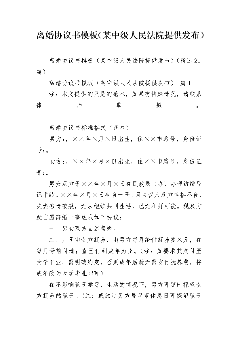 离婚协议书模板(某中级人民法院提供发布)