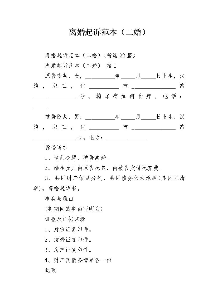 离婚起诉范本(二婚)