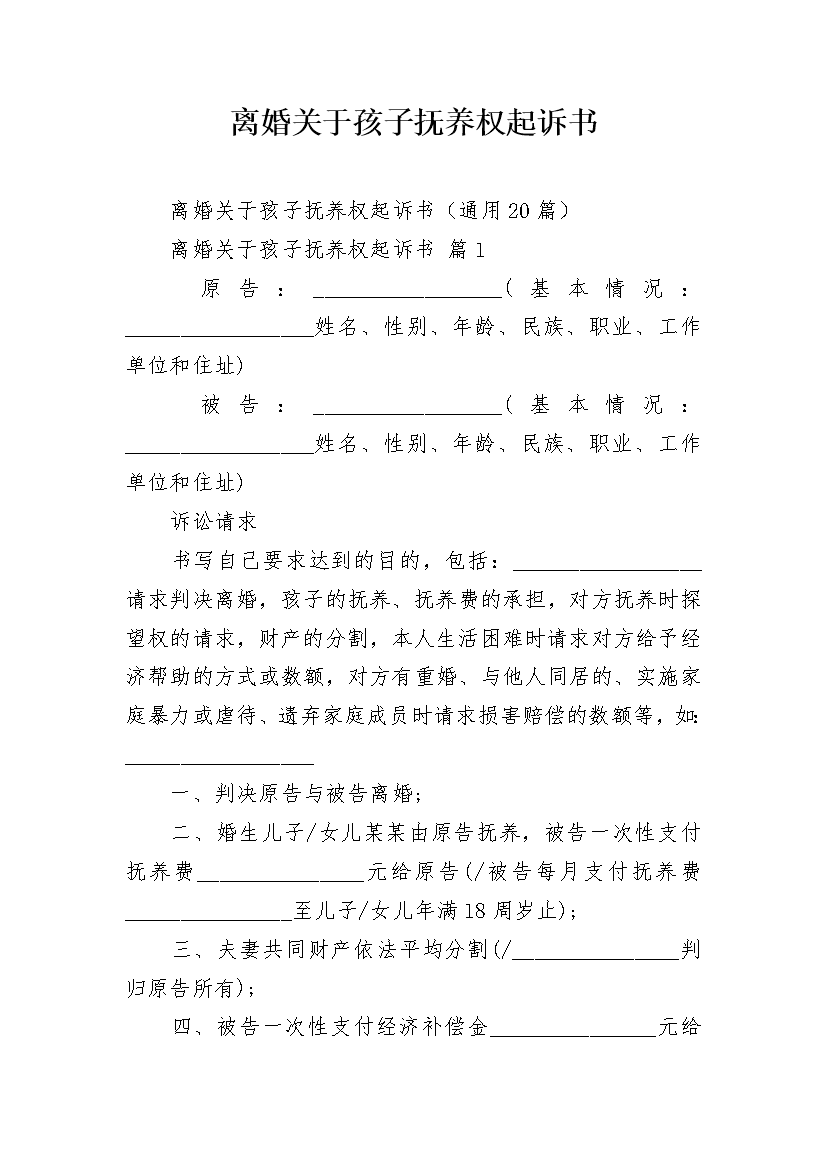 离婚关于孩子抚养权起诉书
