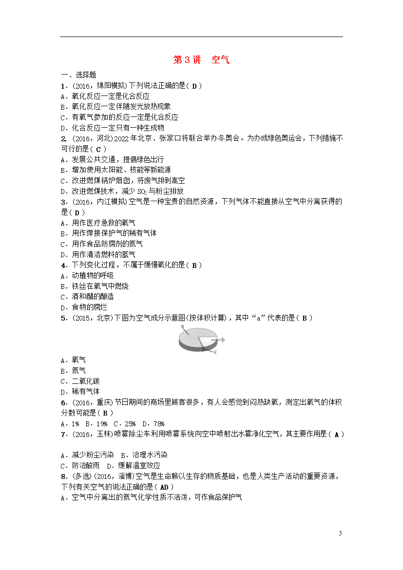 试题-全国-2016_(四川地区)2017中考化学 第1篇 第3讲 空气试题