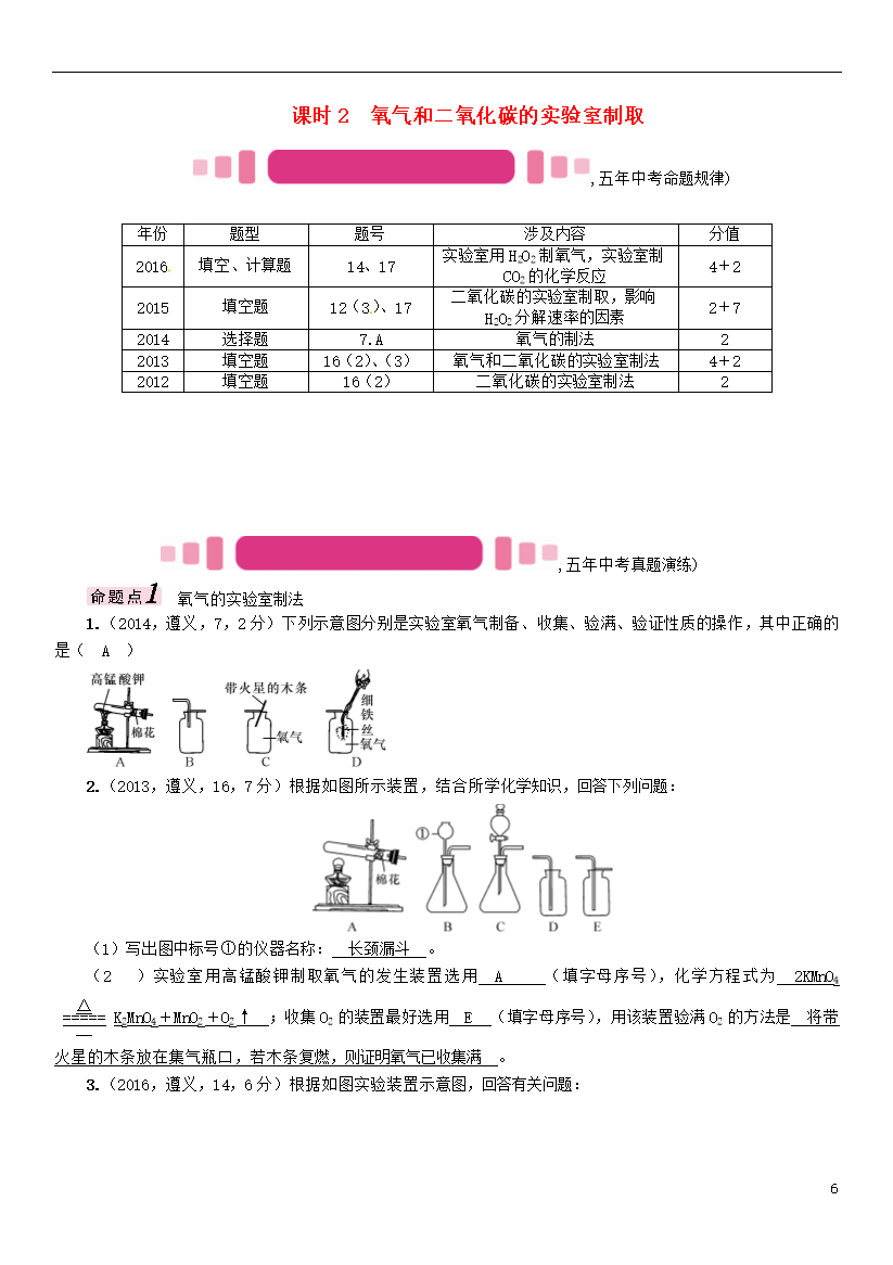 试题-全国-2017_(遵义专版)2017中考化学命题研究 第一编 教材知识梳理篇 第2章 身边的化学物质 课时2 氧气和二氧化碳的实验室制取(精讲)试题