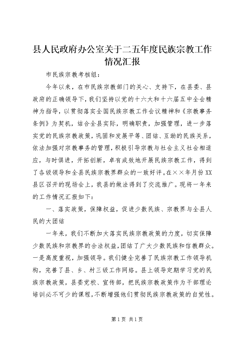 县人民政府办公室关于二五年度民族宗教工作情况汇报 (2)