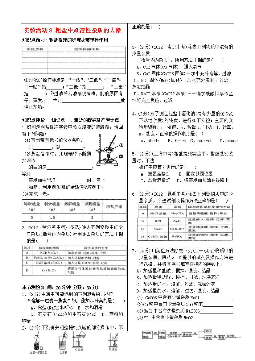 试题-全国-2015_九年级化学下册 第11单元 实验活动8 粗盐中难溶性杂质的去除练习(无答案) 新人教版