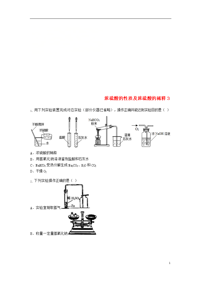 试题-吉林-2018_吉林省吉林市中考化学复习练习 浓硫酸的性质及浓硫酸的稀释3(无答案) 新人教版