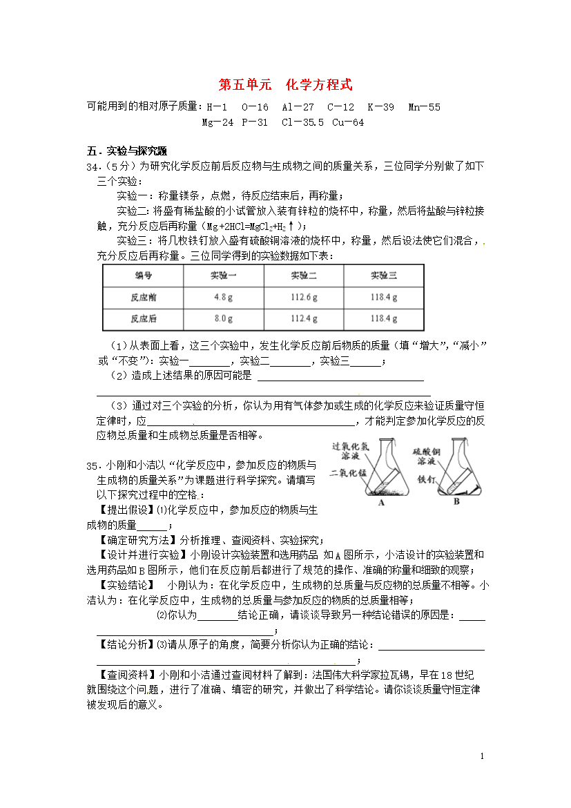 试题-湖北-2015_湖北省黄石市第十六中学九年级化学上册 第五单元 化学方程式复习题五(实验与探究题)(无答案)(新版)新人教版