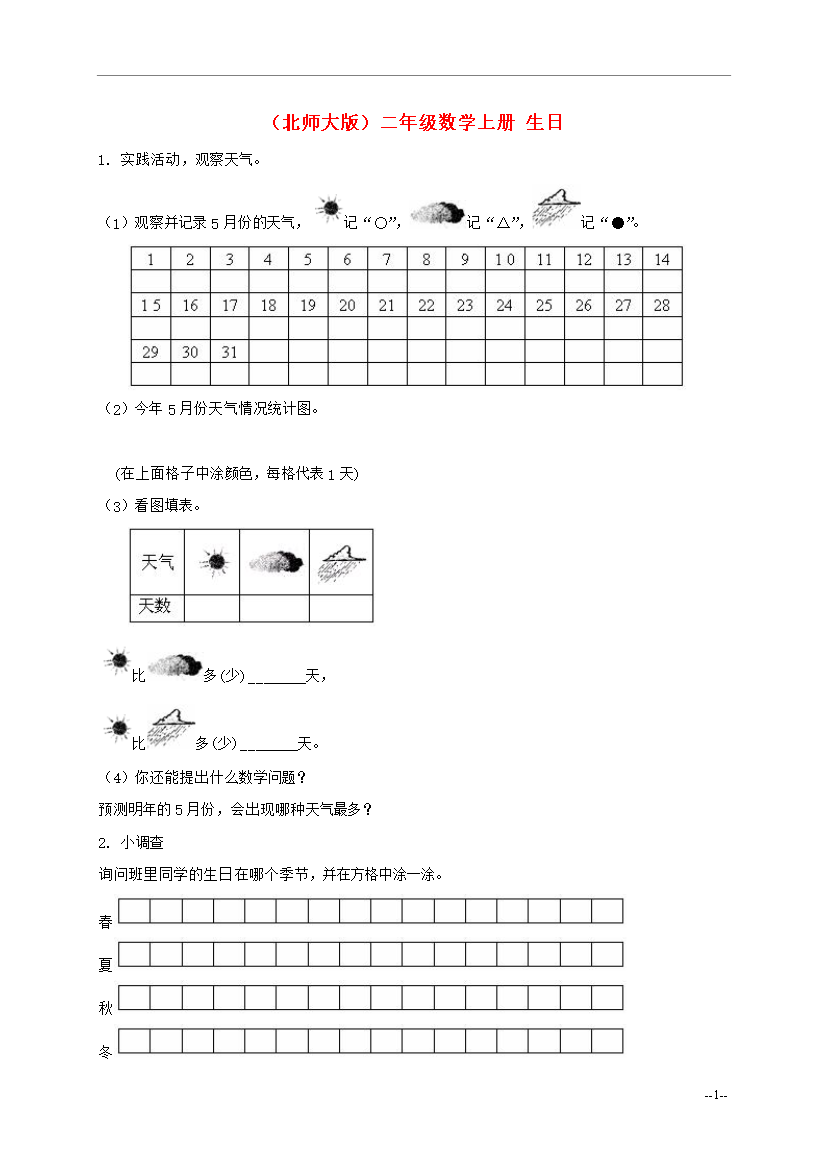 试题-全国-2011_二年级数学上册 生日一课一练(无答案) 北师大版