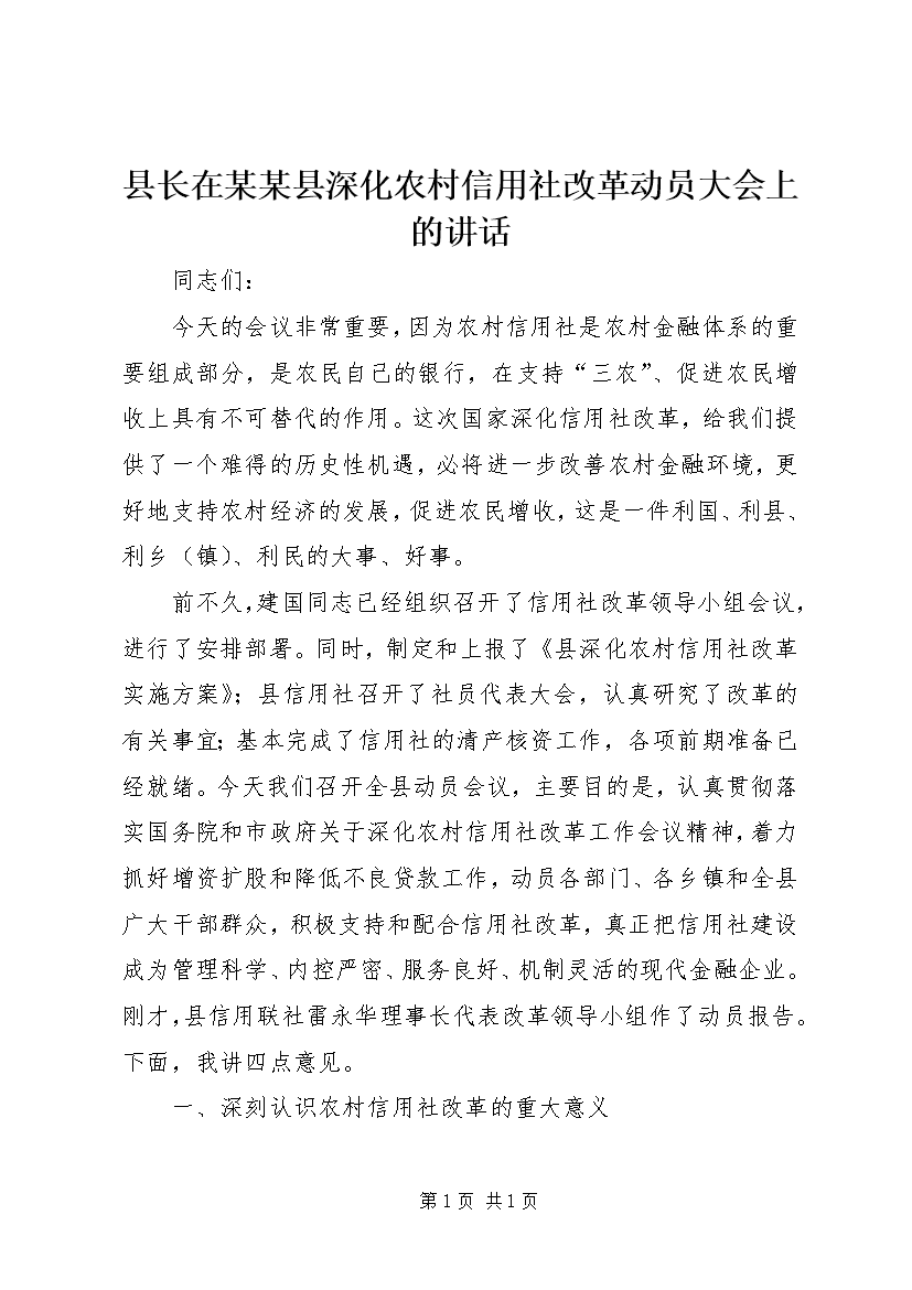 县长在某某县深化农村信用社改革动员大会上的讲话 (2)