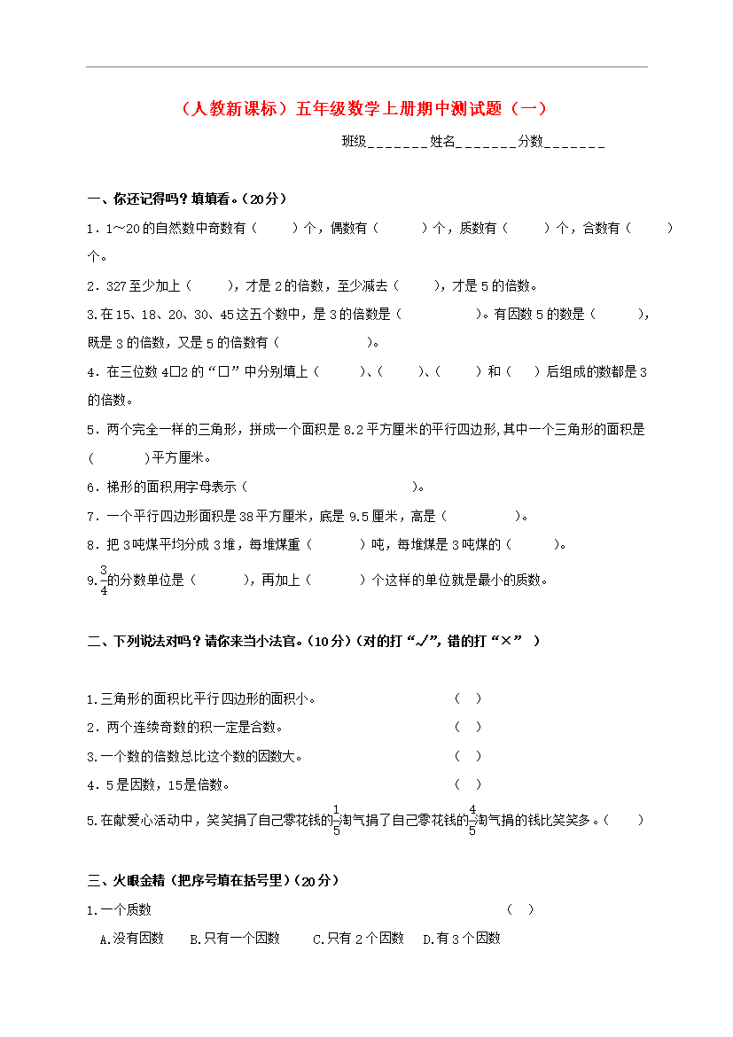试题-全国-2011_五年级数学上学期 期中测试题(一) 人教新课标版