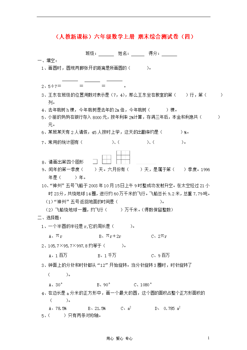 试题-全国-2012_六年级数学上册 期末综合测试卷(四) 人教新课标版