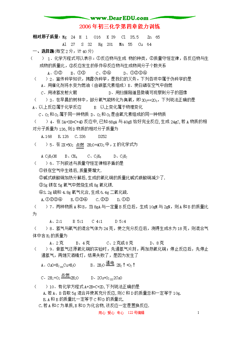 试题-全国-2006_新课标 人教版2006年初三化学第四章能力训练