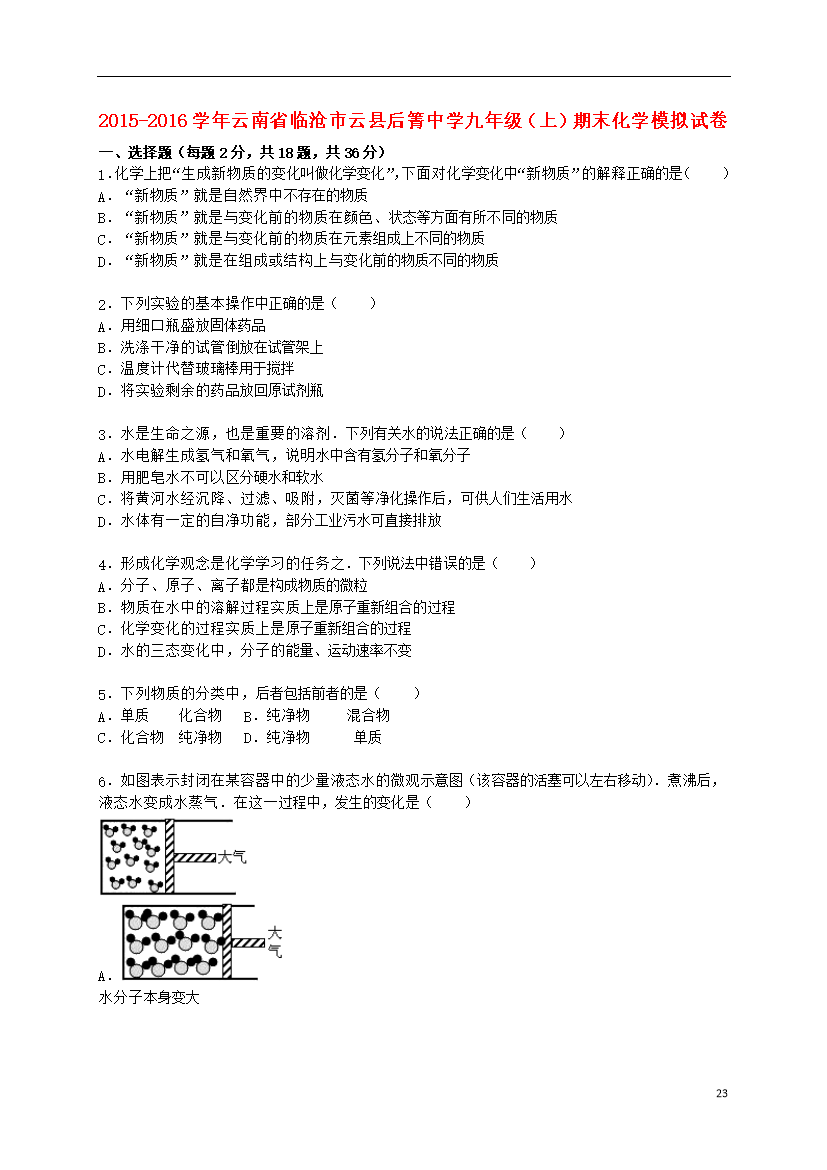 试题-云南-2016_云南省临沧市云县后箐中学2015-2016学年九年级化学上学期期末模拟试题(含解析) 新人教版
