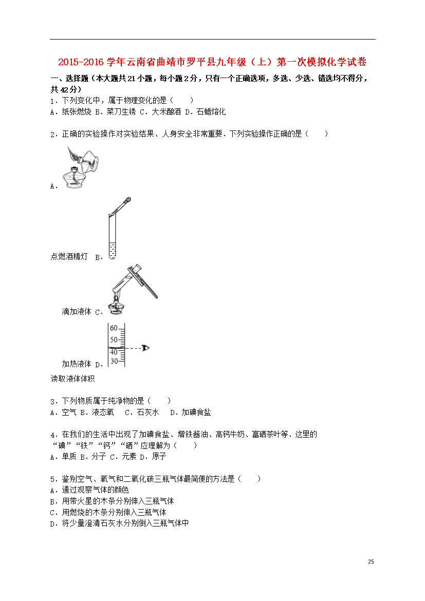 试题-云南-2016_云南省曲靖市罗平县2015-2016学年九年级化学上学期第一次模拟试题(含解析) 新人教版