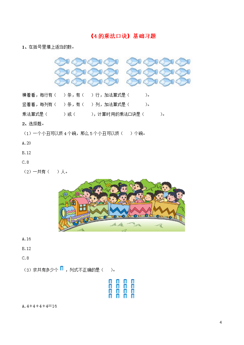 试题-全国-2019_一年级数学下册 二 游乐园里的数学问题 9《4的乘法口诀》基础习题 浙教版