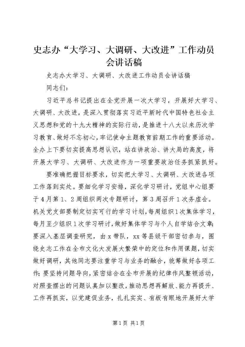 史志办“大学习、大调研、大改进”工作动员会讲话稿