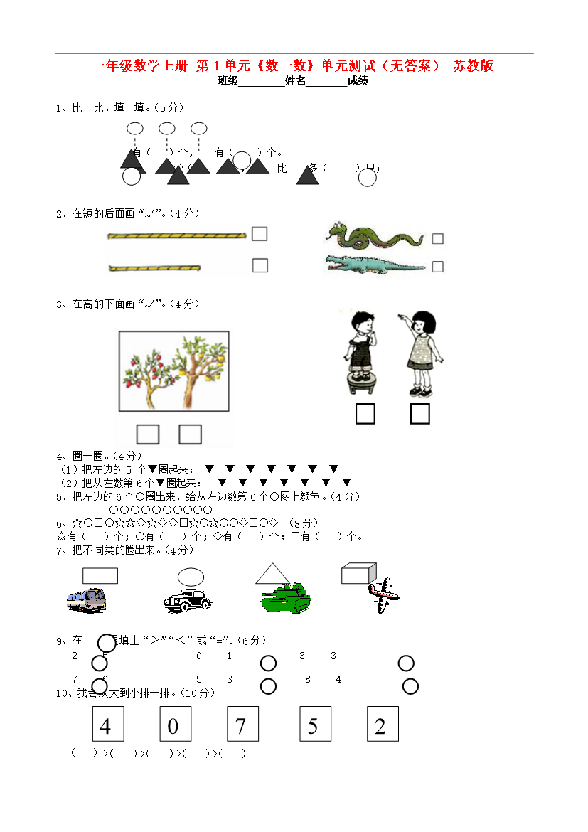试题-全国-2013_一年级数学上册 第1单元《数一数》单元测试(无答案) 苏教版
